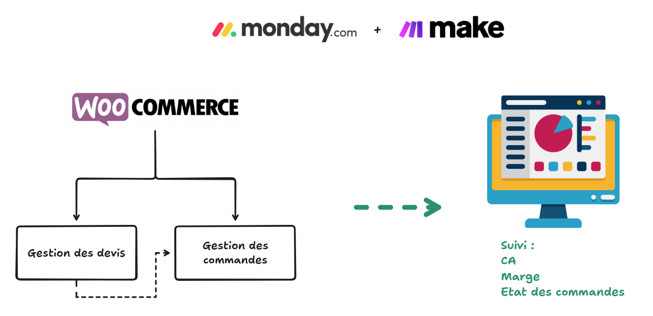Le client gérait ses commandes WooCommerce manuellement. Chaque nouvelle commande devait être saisie dans Monday.com afin de suivre la production, l’expédition et calculer les marges.